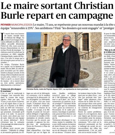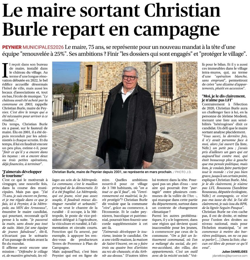 Retrouvez l’interview accordée par Christian Burle, maire sortant de Peynier et tête de liste Peynier Ensemble, au quotidien régional La Provence, publiée dans l’édition d’Aix du 30 janvier 2026.