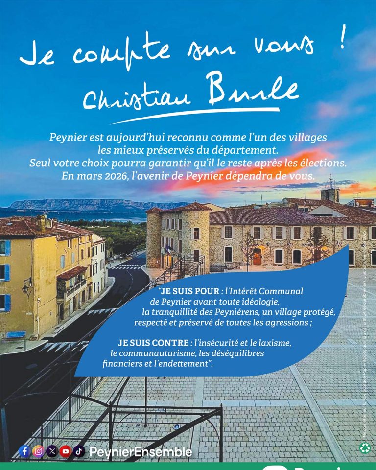“Peynier est aujourd’hui reconnu comme l’un des villages les mieux préservés du département. Seul votre choix pourra garantir qu’il le reste après les élections. En mars 2026, l’avenir de Peynier dépendra de vous.”